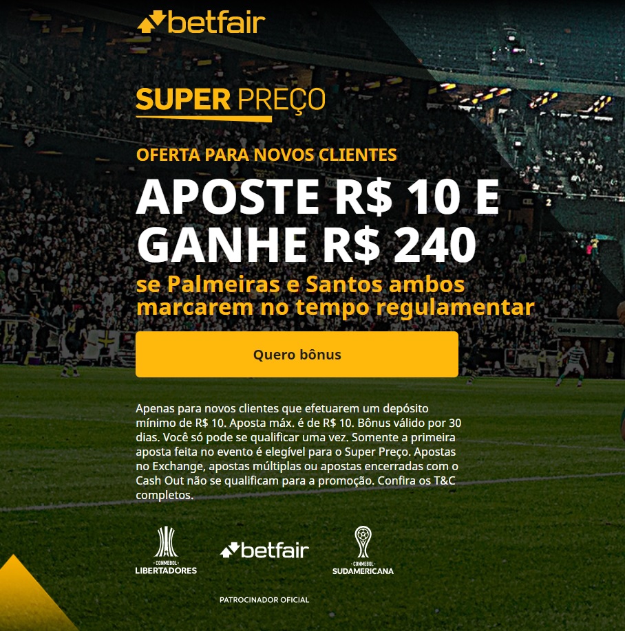 - Por fim, encontre o jogo Palmeiras x Santos, do dia 30 de janeiro. Então, efetue sua aposta pré-jogo (máximo de R$10) na opção “Ambas as Equipes Marcam”, no mercado de Probabilidades. O ícone da Betfair Super Preço deve estar em destaque;
