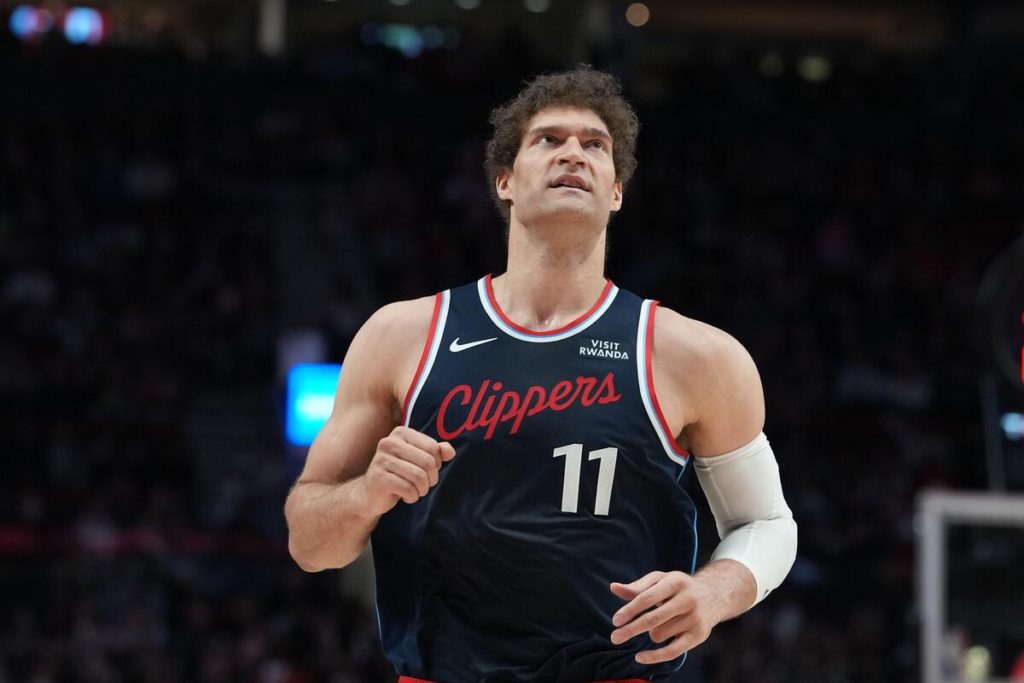 Brook Lopez (Los Angeles Clippers) em partida contra o Portland Trail Blazers, no dia 10 de abril de 2026 (Crédito: Associated Press / Alamy Stock Photo)