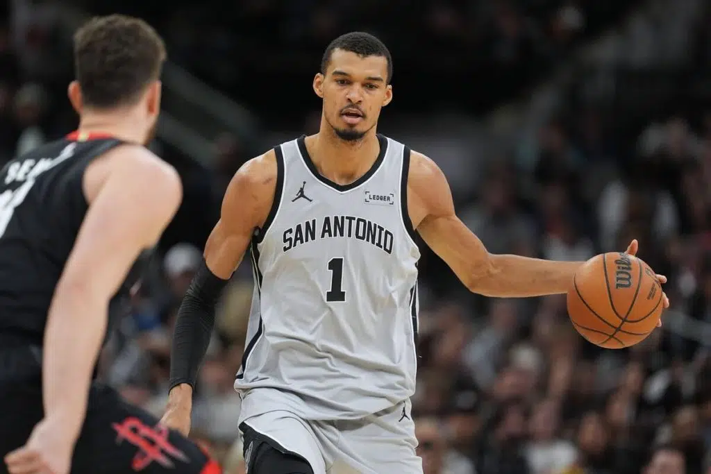 Victor Wembanyama (San Antonio Spurs) em partida contra o Houston Rockets, no dia 8 de março de 2026 (Crédito: Associated Press / Alamy Stock Photo)